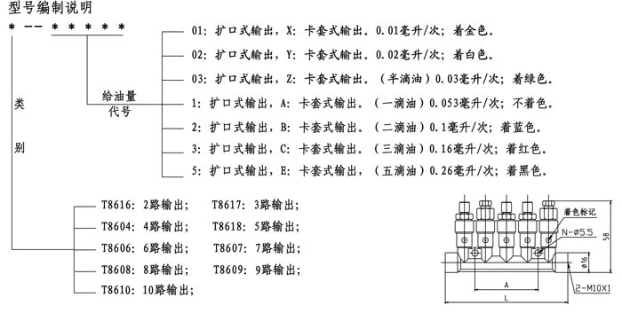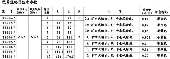 “T86”型容積式定量分配器:適用于周期工作的卸壓式潤滑系統(tǒng)。系統(tǒng)加壓時各路分配器輸出設(shè)定量的潤滑油;卸壓時,分配器活塞復(fù)位計量儲油。每次工作都包括加壓和卸壓兩個過程。分配器工作一次輸出油量的多少取決于活塞行程的長短。因此它能將潤滑介質(zhì)每次按設(shè)定的給油量恒定輸出而不受其他因素(泵油時間、潤滑點(diǎn)位置高低遠(yuǎn)近、溫度變化等)的影響。定量分配器每路給油量可在規(guī)格范圍內(nèi)任意選擇;輸出口形式有卡套式和擴(kuò)口式兩種選擇;安裝時可任意串接或并接于系統(tǒng)主管路。工作壓力:1.8MPa(稀油)或2.5 MPa(油脂)。適用油液范圍:N22#-N320#潤滑油或000#油脂。其中"01(X)、02(Y)、03(Z)"三種給油規(guī)格屬于精準(zhǔn)微量級給油。