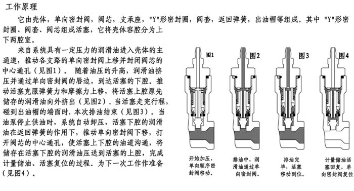“T86”型容積式定量分配器:適用于周期工作的卸壓式潤滑系統(tǒng)。系統(tǒng)加壓時(shí)各路分配器輸出設(shè)定量的潤滑油;卸壓時(shí),分配器活塞復(fù)位計(jì)量儲(chǔ)油。每次工作都包括加壓和卸壓兩個(gè)過程。分配器工作一次輸出油量的多少取決于活塞行程的長短。因此它能將潤滑介質(zhì)每次按設(shè)定的給油量恒定輸出而不受其他因素(泵油時(shí)間、潤滑點(diǎn)位置高低遠(yuǎn)近、溫度變化等)的影響。定量分配器每路給油量可在規(guī)格范圍內(nèi)任意選擇;輸出口形式有卡套式和擴(kuò)口式兩種選擇;安裝時(shí)可任意串接或并接于系統(tǒng)主管路。工作壓力:1.8MPa(稀油)或2.5 MPa(油脂)。適用油液范圍:N22#-N320#潤滑油或000#油脂。其中"01(X)、02(Y)、03(Z)"三種給油規(guī)格屬于精準(zhǔn)微量級(jí)給油。