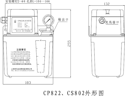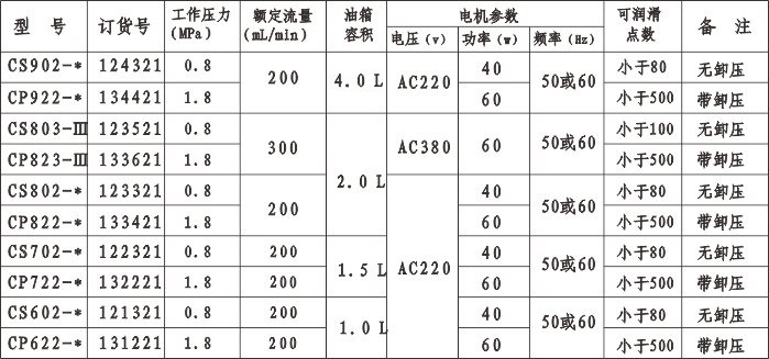 “CP822”系列電動(dòng)潤(rùn)滑泵是一款單相電機(jī)驅(qū)動(dòng)齒輪泵。內(nèi)含自動(dòng)卸荷閥,屬間歇工作泵。根據(jù)不同用途,可選擇配置液位開(kāi)關(guān)、壓力開(kāi)關(guān)。用于需周期工作的容積式定量集中潤(rùn)滑系統(tǒng)。電動(dòng)泵的工況受外來(lái)指令控制。 工作電源:AC220V;50~60Hz 功率: 60W; 額定壓力:1.8MPa; 額定流量:200ml/min。 適用潤(rùn)滑介質(zhì):N32#~N68#。 “CP822”系列電動(dòng)潤(rùn)滑泵廣泛應(yīng)用于機(jī)床、紡機(jī)、印機(jī)、塑機(jī)、電梯、木工、食品、包裝等機(jī)械設(shè)備的潤(rùn)滑。