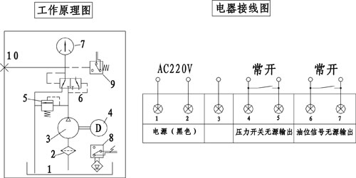 “CP”電動(dòng)泵工作原理:電機(jī)4得電,驅(qū)動(dòng)齒輪泵3運(yùn)轉(zhuǎn).通過(guò)吸油濾網(wǎng)2從油箱1吸入潤(rùn)滑油,經(jīng)自動(dòng)換向閥6壓送至輸出口10輸往系統(tǒng)。電機(jī)失電,停止泵油。換向閥6在差壓信號(hào)的作用下恢復(fù)至左位機(jī)能,溝通主管路卸荷通道。系統(tǒng)壓力經(jīng)自動(dòng)換向閥6快速卸荷到油箱.系統(tǒng)壓力由調(diào)壓閥5控制,壓力表7顯示。油位開(kāi)關(guān)8和壓力開(kāi)關(guān)9作為選配件。