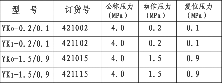 膜片式壓力控制元件,YK0常開(kāi)型(YK1常閉型),當(dāng)被測(cè)壓力大于壓力開(kāi)關(guān)的動(dòng)作壓力時(shí),壓力開(kāi)關(guān)閉合(斷開(kāi))。當(dāng)系統(tǒng)壓力小于壓力開(kāi)關(guān)的復(fù)位值時(shí),壓力開(kāi)關(guān)恢復(fù)常態(tài):開(kāi)路(閉合)。