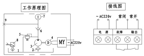 “AS”系列自動泵工作原理:將間歇時間、工作時間設定后,“MY”型控制器控制電機4的工作和間歇。電機4得電,驅動齒輪泵3運轉。通過吸油濾網2從油箱1吸入潤滑油,經單向閥6 壓送至輸出口9輸往系統(tǒng)。電機失電,停止泵油,系統(tǒng)壓力由調壓閥5控制,壓力表7 顯示。液位開關8隨時檢測油位,輸出無源常開信號。