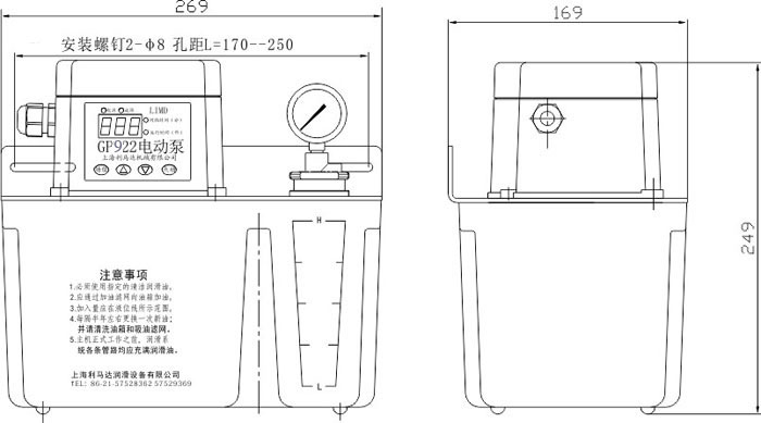 "GP922"系列自動(dòng)潤滑泵是一種電機(jī)驅(qū)動(dòng)齒輪泵。含"SK5"型電腦芯片控制器、液位開關(guān)、壓力開關(guān)、自動(dòng)卸荷閥、溢流閥等,屬間歇工作泵。用于需周期工作的容積式定量集中潤滑系統(tǒng)。 油泵電機(jī)的運(yùn)行時(shí)間和間歇時(shí)間均采用數(shù)碼管顯示。 油泵外型尺寸:269X169X255. 工作電源:AC220v,50/60(Hz); 保險(xiǎn)絲規(guī)格:Φ5×20(1A); 額定壓力:1.8MPa; 油箱容積:4L; 適用潤滑介質(zhì):N32#~N68#潤滑油。