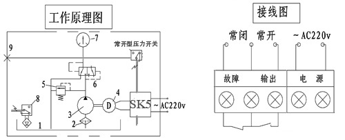 工作原理 "GP"自動(dòng)泵工作原理:將間歇時(shí)間設(shè)定后,"SK5"型控制器控制電機(jī)4驅(qū)動(dòng)齒輪泵3 運(yùn)轉(zhuǎn)。通過吸油濾網(wǎng)2從油箱1吸入潤滑油,經(jīng)自動(dòng)換向閥6 壓送至輸出口9 輸往潤滑系統(tǒng)。當(dāng)潤滑系統(tǒng)分油結(jié)束,系統(tǒng)壓力上升到常開型壓力開關(guān)動(dòng)作壓力時(shí),"SK5"型控制器控制收到通態(tài)信號,即指令油泵電機(jī)延時(shí)運(yùn)轉(zhuǎn)5秒鐘停止。期間系統(tǒng)壓力繼續(xù)上升,穩(wěn)定到溢流閥5的調(diào)定壓力。停止泵油,自動(dòng)換向閥6 在差壓信號的作用下恢復(fù)至左位機(jī)能,溝通主管路卸荷通道。系統(tǒng)壓力經(jīng)自動(dòng)換向閥6 快速卸荷到油箱。額定壓力由調(diào)壓閥5控制,壓力表7 顯示。液位開關(guān)8隨時(shí)檢測油位,當(dāng)油位低于下限位置時(shí),油泵即發(fā)出故障報(bào)警,輸出聯(lián)控信號等。當(dāng)油位超過下限時(shí),油泵恢復(fù)正常工況,故障報(bào)警消失。