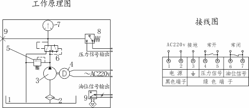 二、工作原理 “CP268”電動泵工作原理:電機4得電,驅(qū)動齒輪泵3運轉(zhuǎn),通過吸油濾網(wǎng)2從油箱1吸入潤滑油,經(jīng)自動換向閥6壓送至輸出口10輸往系統(tǒng)。當(dāng)系統(tǒng)壓力達(dá)到壓力開關(guān)設(shè)定值時,常開型壓力開關(guān)發(fā)出通態(tài)信號。電機失電,停止泵油。換向閥6在差壓信號的作用下恢復(fù)至左位機能,溝通主管路卸荷通道。系統(tǒng)壓力經(jīng)自動換向閥6快速卸荷到油箱,當(dāng)系統(tǒng)壓力降到壓力開關(guān)復(fù)位值時,常開型壓力開關(guān)發(fā)出斷態(tài)信號。液位開關(guān)9隨時監(jiān)測油箱內(nèi)的油位,當(dāng)無油或油位低于下限位置時油位開關(guān)輸出通態(tài)信號,當(dāng)油位高于下限位置時輸出斷態(tài)信號。系統(tǒng)壓力由調(diào)壓閥5控制,壓力表7顯示。