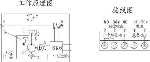 二、工作原理 “GP268”智能泵工作原理:將間歇時間設(shè)定后,即進(jìn)入間歇計時狀態(tài),中途斷電再次通電后繼續(xù)遞減計時,累計計滿預(yù)設(shè)的間歇時間!癝K6”型控制器確認(rèn)常開型壓力開關(guān) 8復(fù)位的前提下(斷態(tài)信號,通態(tài)報警),控制電機4運轉(zhuǎn)驅(qū)動齒輪泵3泵油,經(jīng)自動換向閥6壓送至輸出口9輸往潤滑系統(tǒng)。當(dāng)系統(tǒng)分油結(jié)束,壓力上升到壓力開關(guān)動作壓力時,“SK6”型控制器指令油泵電機繼續(xù)運轉(zhuǎn)10秒鐘(這是保壓時間,可調(diào))。期間系統(tǒng)壓力穩(wěn)定到溢流閥5的調(diào)定壓力(保壓)。停泵時,換向閥6在差壓信號的作用下恢復(fù)至左位機能,溝通主管路卸荷通道。系統(tǒng)壓力卸壓。油箱油位下降到下限位置時,油位開關(guān)1發(fā)通態(tài)信號。額定壓力由調(diào)壓閥5控制,壓力表7顯示。
