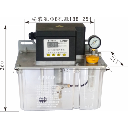 一、概述 “GP468”智能潤滑泵,內含“SK6”型控制器、自動卸荷閥、自動排氣內閥、溢流閥、低油位報警、壓力開關等,其中壓力開關使用壽命高達100萬次,屬間歇工作泵。用于需周期工作的容積式定量集中潤滑系統(tǒng)。泵油間歇時間設置范圍:1~999分鐘(倒計時),具有斷電記憶功能;每次泵油時間長短根據(jù)環(huán)境溫度變化、負載多少自動調整;油泵的運行時間和間歇時間均采用數(shù)碼管顯示。 工作電源:AC220v,50/60(Hz); 功率:60(w);額定壓力:2.5(MPa);額定流量:160(ml/mim); 油箱容量:4升;適用介質:N32#~N320#潤滑油。