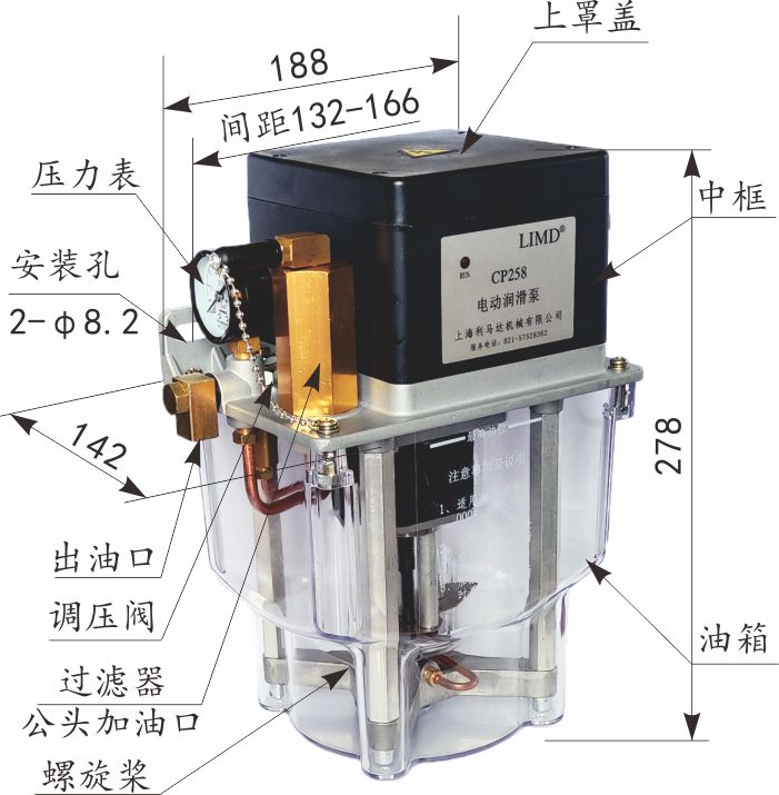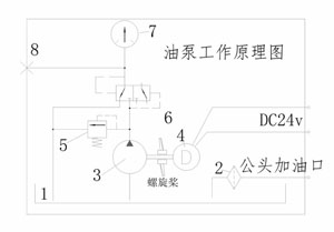 一、概述 CP258型電動(dòng)油脂泵是一種電機(jī)驅(qū)動(dòng)齒輪泵,屬于順置式結(jié)構(gòu):電機(jī)設(shè)在上方,油箱及泵芯設(shè)在下方。內(nèi)含自動(dòng)卸荷閥、調(diào)壓閥、攪拌及壓送油脂的螺旋槳等,屬間歇工作泵。用于需周期工作的容積式定量集中潤(rùn)滑系統(tǒng)。電動(dòng)泵的工況受外來指令控制,得電泵油,失電停泵及自動(dòng)卸壓。 電源電壓:DC24v,額定功率≤120w;額定壓力5.0MPa;額定流量120ml/min。適用潤(rùn)滑介質(zhì):000#、00#、0#油脂。 二、工作原理 “CP258”電動(dòng)泵工作原理:電機(jī)采用雙動(dòng)力輸出,外圈低速旋轉(zhuǎn)驅(qū)動(dòng)螺旋槳及攪拌棒,用于攪拌及壓送油脂,解決油脂凝固及起助吸作用;內(nèi)圈高速旋轉(zhuǎn)驅(qū)動(dòng)泵芯泵油。 電機(jī)1得電,內(nèi)部高速動(dòng)力驅(qū)動(dòng)齒輪泵3運(yùn)轉(zhuǎn),從油箱1吸入油脂,泵出高壓油源。再經(jīng)自動(dòng)換向閥6壓送至輸出口8輸往系統(tǒng)。電機(jī)失電,停止泵油。自動(dòng)換向閥6在差壓信號(hào)的作用下恢復(fù)至左位機(jī)能,溝通主管路卸荷通道。系統(tǒng)壓力由調(diào)壓閥5控制,壓力表7顯示。 三、使用與調(diào)整 1.潤(rùn)滑泵適用環(huán)境溫度:-5°C~ 65°C;潤(rùn)滑介質(zhì):000#、00#、0#油脂。 2.向油泵添加潤(rùn)滑油脂,可用采用快插母頭插入“油脂過濾器上的公頭進(jìn)油口”,加入量應(yīng)在油箱的油位線范圍內(nèi)。向油泵加油結(jié)束后請(qǐng)及時(shí)蓋上公頭加油口的橡膠蓋帽。當(dāng)感覺加油阻力增大,透明油箱內(nèi)油脂過濾器流出的油量變少時(shí),就應(yīng)拆下油脂過濾芯清洗。 3.油泵應(yīng)水平安裝,應(yīng)盡量避免在有腐蝕性氣體、塵埃和高濕環(huán)境下使用。 4.接線時(shí),打開上罩蓋,按接線圖所示,黑色1、2接入DC24V電源,3接地,接線時(shí)應(yīng)注意電源的正負(fù)極性,不能接反。正常轉(zhuǎn)向是從油泵上面往下看螺旋槳順時(shí)針旋轉(zhuǎn);如果正負(fù)極接反,則電源指示燈不亮,螺旋槳逆時(shí)鐘旋轉(zhuǎn)。接通電源后,不允許打開罩蓋,以防發(fā)生電擊危險(xiǎn)。 5.油泵得電,電源指示燈亮,油泵供送壓力油源;油泵失電則電源指示燈滅、停止泵油并且自動(dòng)卸壓。潤(rùn)滑工況由主機(jī)電控箱控制。 6.油泵工作壓力由調(diào)壓閥控制,調(diào)壓閥設(shè)在中框左后側(cè),調(diào)壓方便。調(diào)壓時(shí)請(qǐng)松開并帽,順時(shí)針旋擰調(diào)壓螺釘壓力升高,反之壓力下降。調(diào)壓結(jié)束后請(qǐng)鎖緊并帽。出廠時(shí)均已調(diào)好(5.0 MPa)且鎖緊。用戶一般不要隨意調(diào)節(jié)。