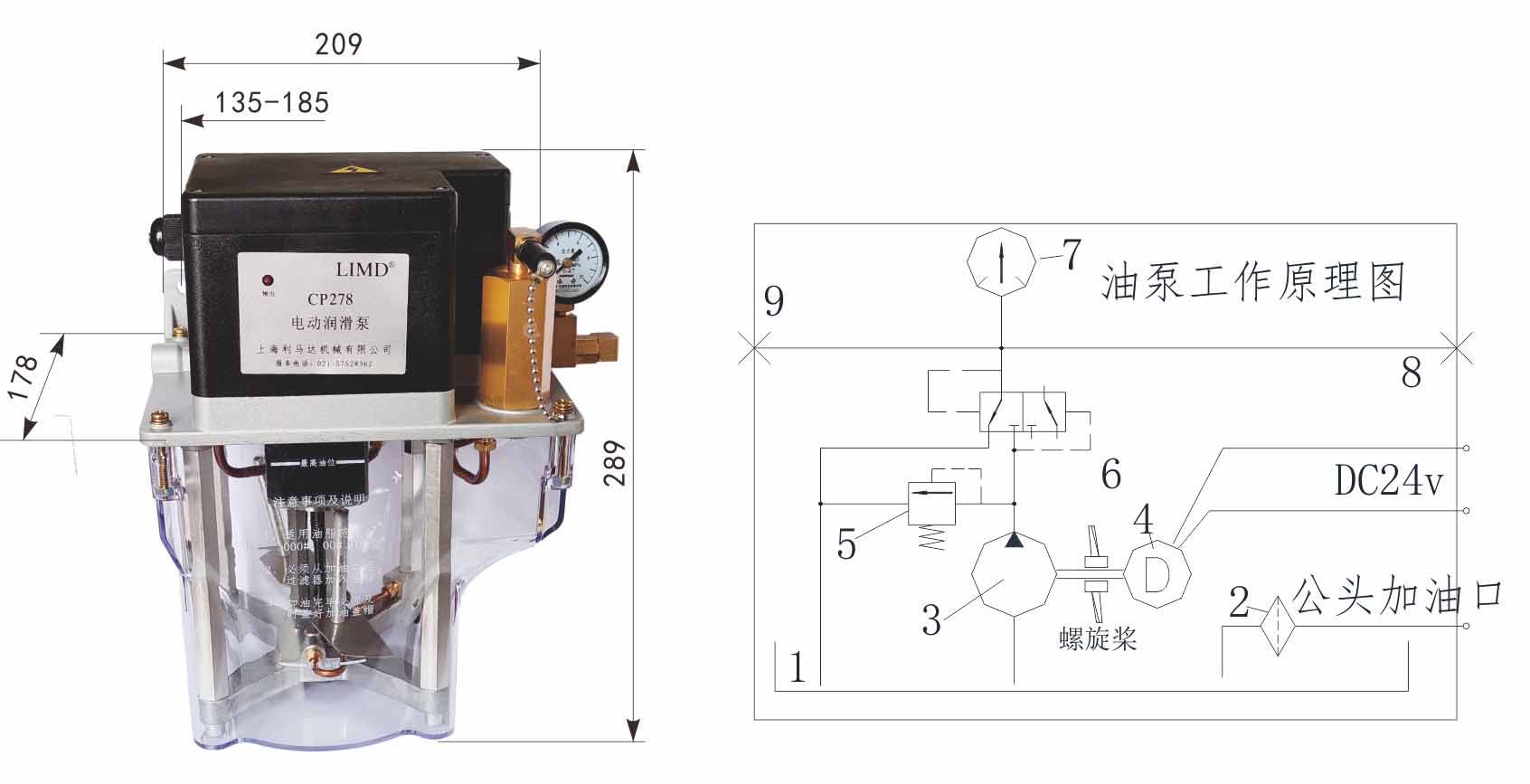 CP278型電動(dòng)油脂泵是一種電機(jī)驅(qū)動(dòng)齒輪泵,屬于順置式結(jié)構(gòu):電機(jī)設(shè)在上方,油箱及泵芯設(shè)在下方。內(nèi)含自動(dòng)卸荷閥、調(diào)壓閥、攪拌及壓送油脂的螺旋槳等,屬間歇工作泵。用于需周期工作的容積式定量集中潤(rùn)滑系統(tǒng)。電動(dòng)泵的工況受外來指令控制,得電泵油,失電停泵及自動(dòng)卸壓。 電源電壓:DC24v,額定功率≤120w;額定壓力5.0MPa;額定流量120ml/min。適用潤(rùn)滑介質(zhì):000#、00#、0#油脂。 “CP278”電動(dòng)泵工作原理:電機(jī)采用雙動(dòng)力輸出,外圈低速旋轉(zhuǎn)驅(qū)動(dòng)螺旋槳及攪拌棒,用于攪拌及壓送油脂,解決油脂凝固及起助吸作用;內(nèi)圈高速旋轉(zhuǎn)驅(qū)動(dòng)泵芯泵油。 電機(jī)1得電,內(nèi)圈高速動(dòng)力驅(qū)動(dòng)泵芯3運(yùn)轉(zhuǎn),從油箱1吸入油脂,泵出高壓油源。再經(jīng)自動(dòng)換向閥6壓送至輸出口8和9輸往系統(tǒng)。電機(jī)失電,停止泵油。自動(dòng)換向閥6在差壓信號(hào)的作用下恢復(fù)至左位機(jī)能,溝通主管路卸荷通道。系統(tǒng)壓力由調(diào)壓閥5控制,壓力表7顯示。