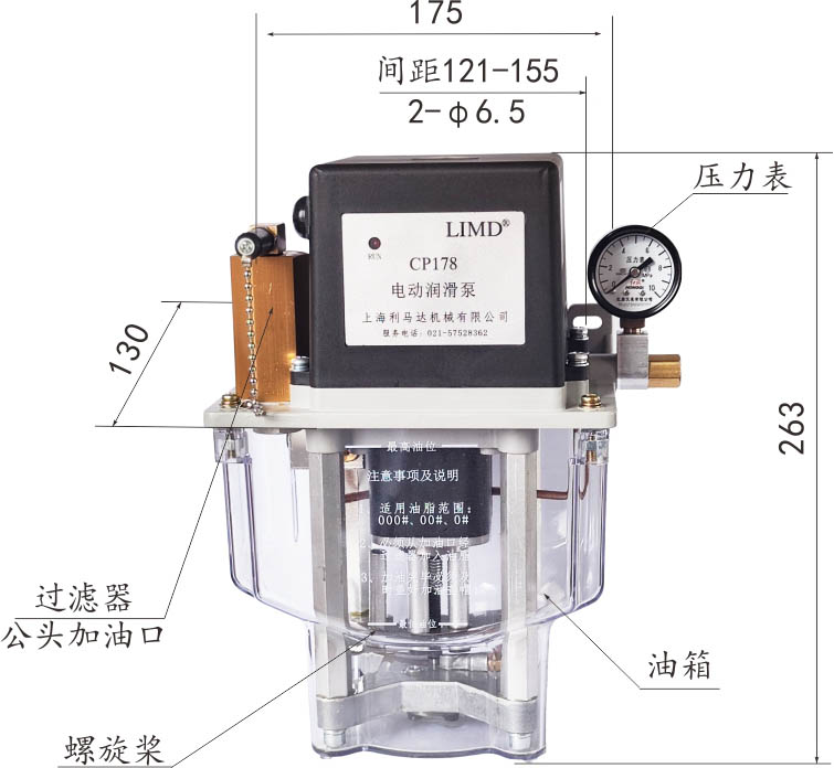 一、概述 CP178型電動(dòng)油脂泵是一種電機(jī)驅(qū)動(dòng)齒輪泵,屬于順置式結(jié)構(gòu):電機(jī)設(shè)在上方,油箱及泵芯設(shè)在下方。內(nèi)含自動(dòng)卸荷閥、調(diào)壓閥、攪拌及壓送油脂的螺旋槳等,屬間歇工作泵。用于需周期工作的容積式定量集中潤滑系統(tǒng)。電動(dòng)泵的工況受外來指令控制,得電泵油,失電停泵及自動(dòng)卸壓。 電源電壓:DC24v,額定功率≤120w;額定壓力5.0MPa;額定流量120ml/min。油箱容積:1.5L;適用潤滑介質(zhì):000#、00#、0#油脂。 二、工作原理 “CP178”電動(dòng)泵工作原理:電機(jī)采用雙動(dòng)力輸出,外圈低速旋轉(zhuǎn)驅(qū)動(dòng)螺旋槳及攪拌棒,用于攪拌及壓送油脂,解決油脂凝固及起助吸作用;內(nèi)圈高速旋轉(zhuǎn)驅(qū)動(dòng)泵芯泵油。 電機(jī)1得電,內(nèi)部高速動(dòng)力驅(qū)動(dòng)齒輪泵3運(yùn)轉(zhuǎn),從油箱1吸入油脂,泵出高壓油源。再經(jīng)自動(dòng)換向閥6壓送至輸出口8輸往系統(tǒng)。電機(jī)失電,停止泵油。自動(dòng)換向閥6在差壓信號的作用下恢復(fù)至左位機(jī)能,溝通主管路卸荷通道。系統(tǒng)壓力由調(diào)壓閥5控制,壓力表7顯示。 三、使用與調(diào)整 1.潤滑泵適用環(huán)境溫度:-5°C~ 65°C;潤滑介質(zhì):000#、00#、0#油脂。 2.向油泵添加潤滑油脂,可用采用快插母頭插入“油脂過濾器上的公頭進(jìn)油口”,加入量應(yīng)在油箱的油位線范圍內(nèi)。向油泵加油結(jié)束后請及時(shí)蓋上公頭加油口的橡膠蓋帽。當(dāng)感覺加油阻力增大,透明油箱內(nèi)油脂過濾器流出的油量變少時(shí),就應(yīng)拆下油脂過濾芯清洗。 3.油泵應(yīng)水平安裝,應(yīng)盡量避免在有腐蝕性氣體、塵埃和高濕環(huán)境下使用。 4.接線時(shí),打開上罩蓋,按接線圖所示,黑色1、2接入DC24V電源,3接地,接線時(shí)應(yīng)注意電源的正負(fù)極性,不能接反。正常轉(zhuǎn)向是從油泵上面往下看螺旋槳順時(shí)針旋轉(zhuǎn);如果正負(fù)極接反,則電源指示燈不亮,螺旋槳逆時(shí)鐘旋轉(zhuǎn)。接通電源后,不允許打開罩蓋,以防發(fā)生電擊危險(xiǎn)。 5.油泵得電,電源指示燈亮,油泵供送壓力油源;油泵失電則電源指示燈滅、停止泵油并且自動(dòng)卸壓。潤滑工況由主機(jī)電控箱控制。 6.油泵工作壓力由調(diào)壓閥控制,調(diào)壓閥設(shè)在中框左后側(cè),調(diào)壓方便。調(diào)壓時(shí)請松開并帽,順時(shí)針旋擰調(diào)壓螺釘壓力升高,反之壓力下降。調(diào)壓結(jié)束后請鎖緊并帽。出廠時(shí)均已調(diào)好(5.0 MPa)且鎖緊。用戶一般不要隨意調(diào)節(jié)。 |
